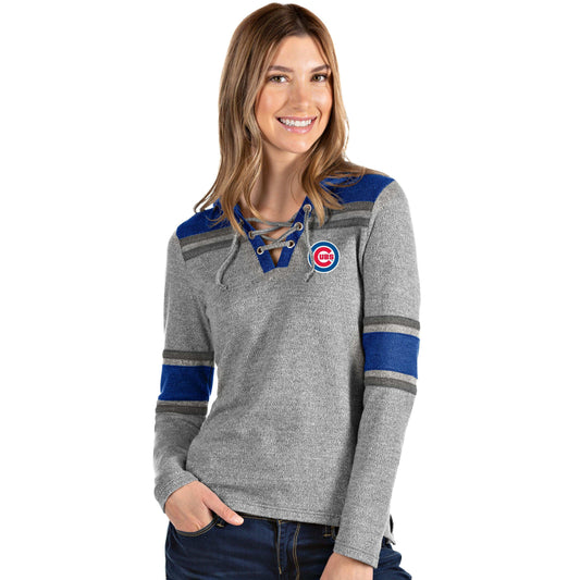 Women's Chicago Blackhawks Antigua Heathered Black Recruit Pullover Sweater