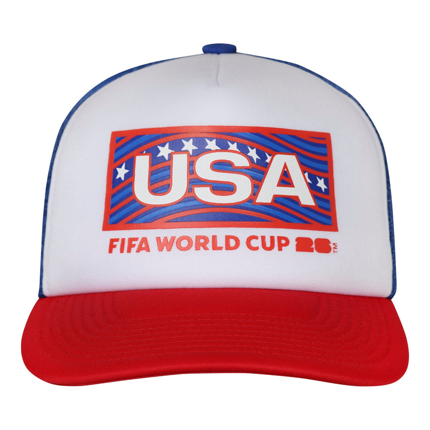 This classic trucker style cap celebrates Team USA's 2026 FIFA World Cup campaign. Features the iconic red, white, and blue colorway with breathable mesh panels and an adjustable snapback closure for a comfortable fit all day long. Constructed from 100% polyester for durability and easy care. Perfect for fans showing their patriotic spirit at matches, tailgates, or everyday wear.