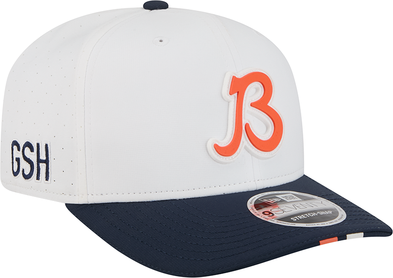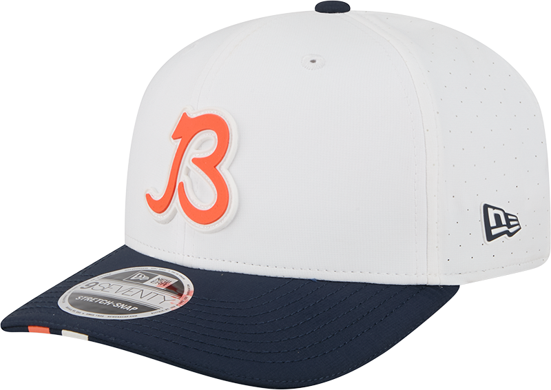 The Men's Chicago Bears New Era 9SEVENTY Adjustable Hat offers a professional-level design with a structured mid crown and semi-curved visor accented by multi-layer team color stripes. Made from a durable 97% polyester and 3% spandex blend, it features MICROERA™ antimicrobial technology to minimize odor and COOLERA® fabric to wick away sweat, ensuring comfort during extended wear. Breathable perforated panels enhance airflow, while the rubberized team logo and woven NFL Shield tag confirm its official licensing. The snap closure provides a customizable fit, making this hat authentic Training Camp gear favored by players, coaches, and staff.