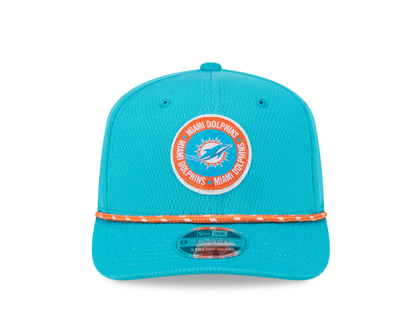 Introducing the Men's Miami Dolphins New Era 2024 Sideline Aqua 9SEVENTY Adjustable Hat. Stay fresh and comfortable with MICROERA™ technology that fights odor and COOLERA® technology that wicks away sweat. This officially licensed hat features embroidered graphics, a performance stretch sweatband, and a snap closure for the perfect fit. Perfect for any Dolphins fan!