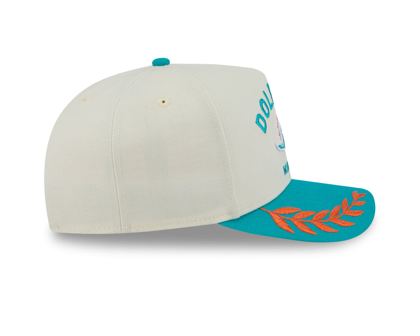 Expertly crafted by New Era, this Men's Miami Dolphins adjustable hat features a 9FIFTY snapback design with a high-profile pinched shape for a unique and bold look. Made with a curved bill, this officially licensed hat is perfect for any devoted fan.