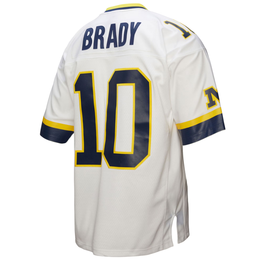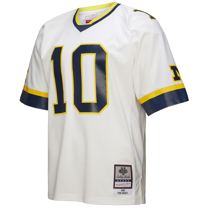 This Men's Tom Brady #10 Michigan Wolverines 1999 White Mitchell & Ness Legacy NCAA Jersey is a premium jersey that boasts high-quality details, an iconic design inspired by Brady's 1999 season, and authentic craftsmanship. Made from durable polyester with breathable mesh for optimal comfort, this officially licensed jersey is a must-have for any football fan looking for a classic, loose-fitting retro-style. Join the College Vault Collection and show your support for the Michigan Wolverines!