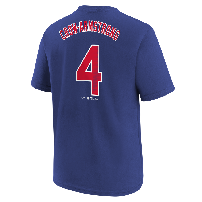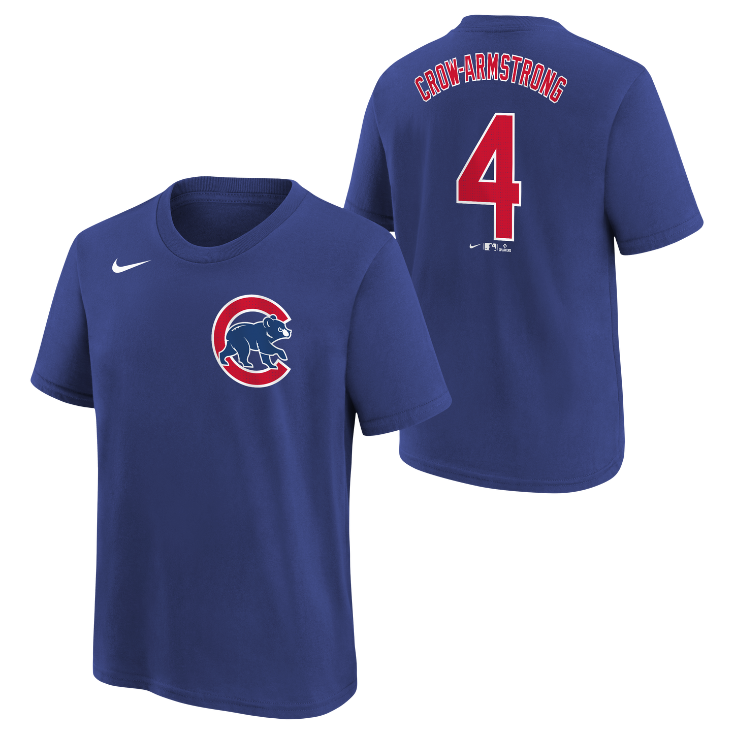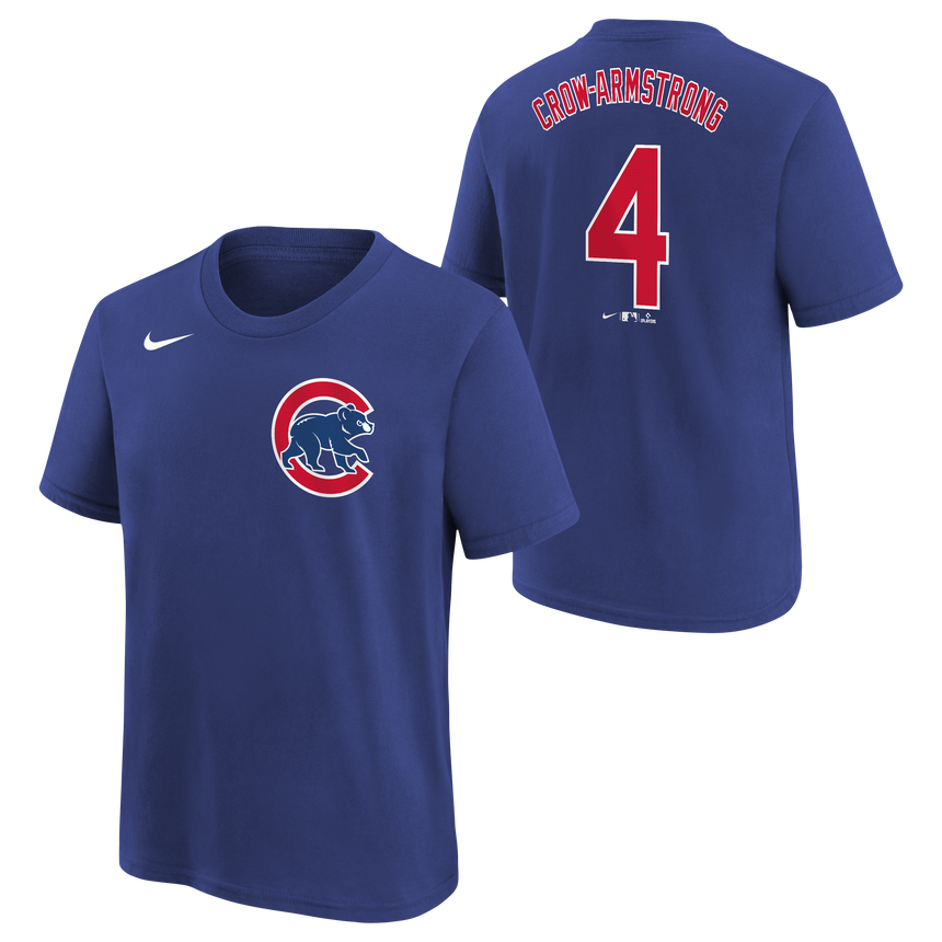 Strike them out in style with the Youth Chicago Cubs Pete Crow-Armstrong Royal Blue Nike Name And Number Tee. Made with 100% cotton and featuring a crew neck and short sleeves, this tee is perfect for any young Cubs fan. With screen print graphics and an officially licensed design, your little one will be the ultimate fan. Machine washable for easy care.