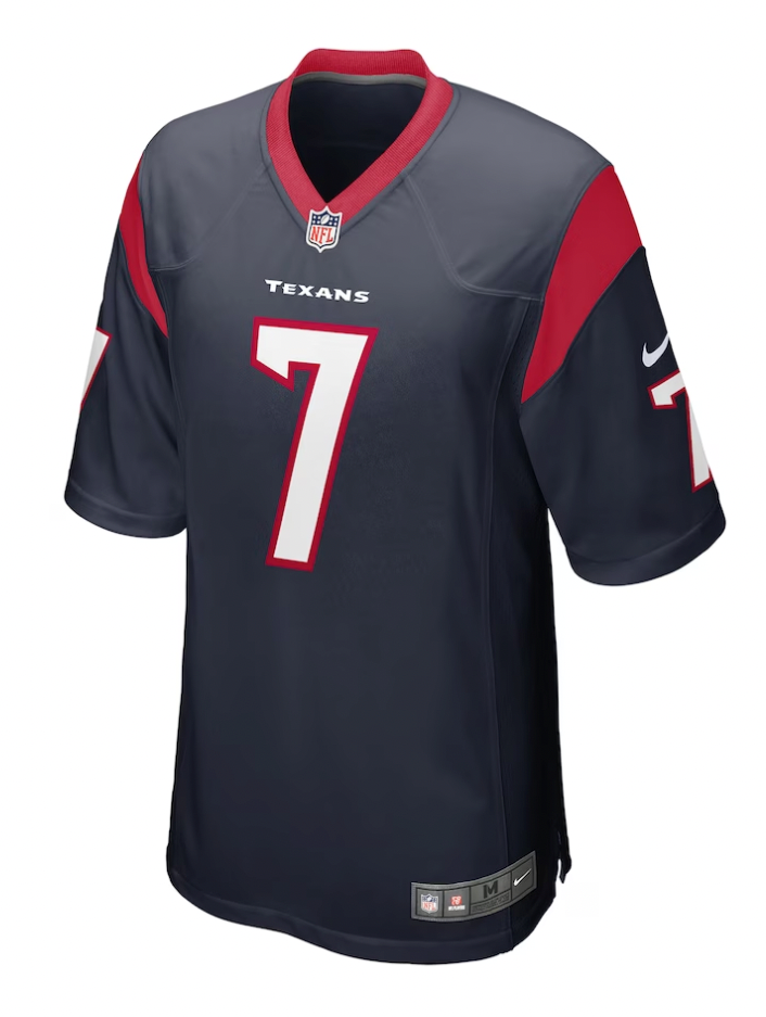 Represent your team with the Youth Houston Texans C.J. Stroud Nike Navy Game Jersey. Made with 100% polyester, this jersey features a tagless collar for comfort, mesh side panels for breathability, and a tailored design for movement. The screen print name, numbers, and logos add an official touch. Go Texans! (Officially licensed. Machine washable. Imported by Nike.)